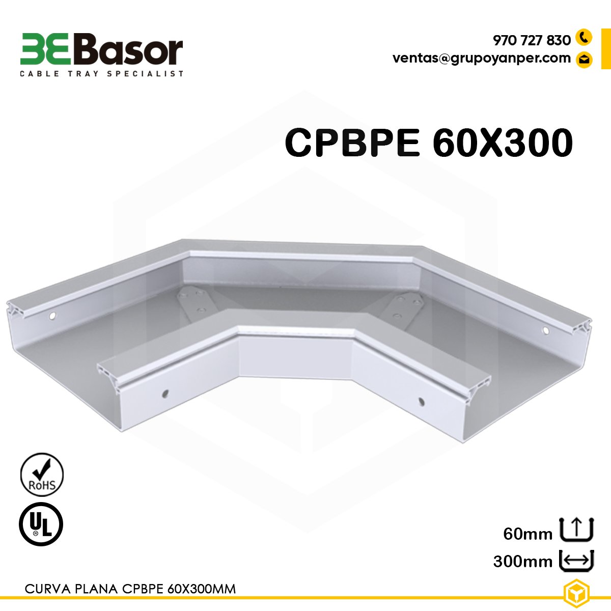 La Curva Plana CPBPE 60×300mm Ref. 210089 es un accesorio en PVC M1 UV, ideal para adaptarse a cambios de dirección en canalizaciones de bandejas portacables exteriores. Fabricada para un ancho de 300 mm y una altura de 60 mm, pesa aproximadamente 0,4 kg/m, lo que la hace ligera y fácil de instalar, a la vez que proporciona un acabado robusto y resistente a la intemperie.