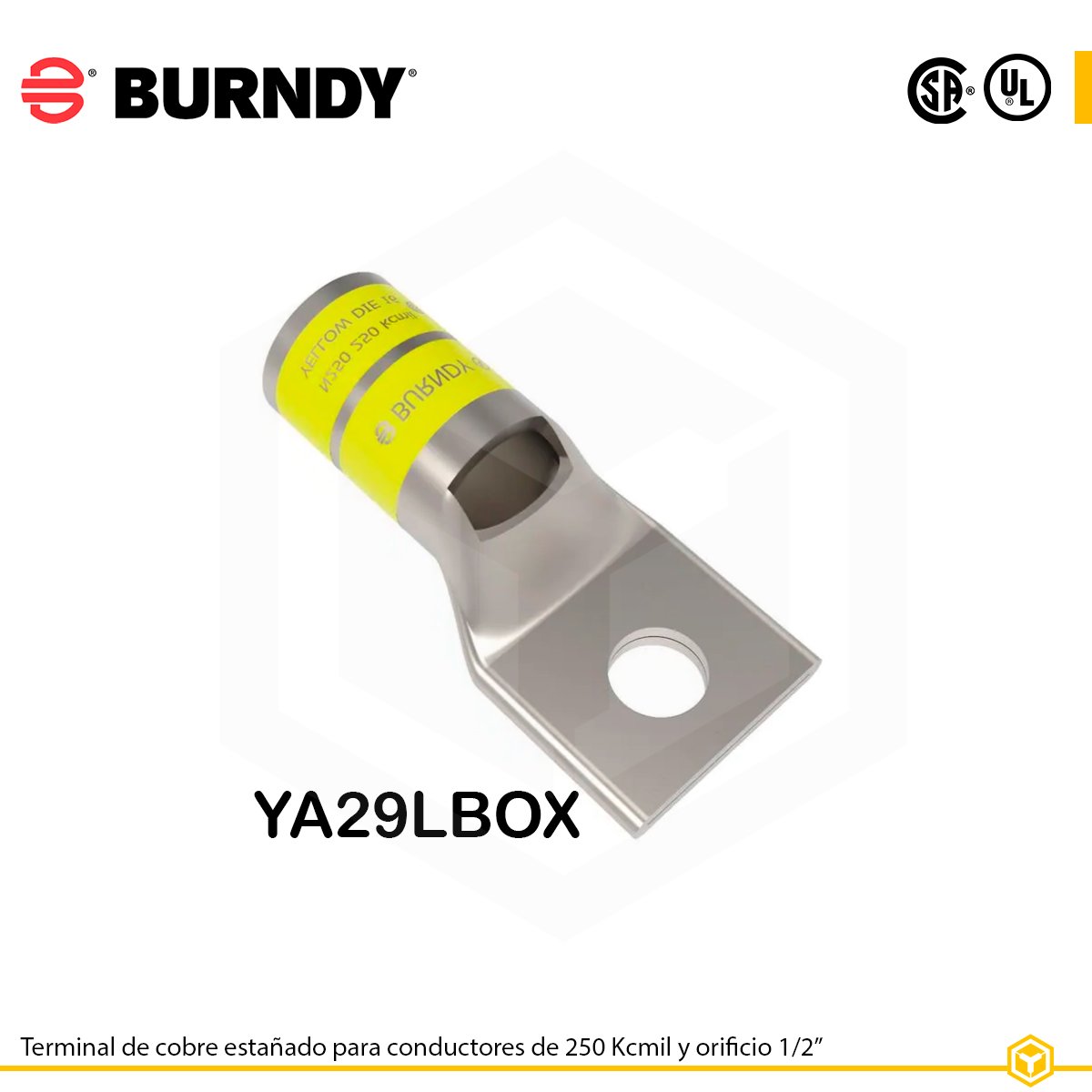 Terminal Burndy YA29LBOX para cable de 250 kcmil, cobre estañado, con orificio de 1/2″ y ventana de inspección. Alta confiabilidad para instalaciones industriales.