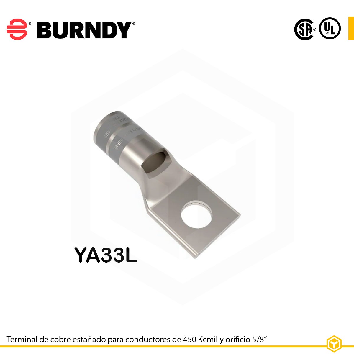 Terminal Burndy YA33L para 450 kcmil, cobre estañado, orificio de 5/8″. Conexión confiable para tableros y centros de distribución.