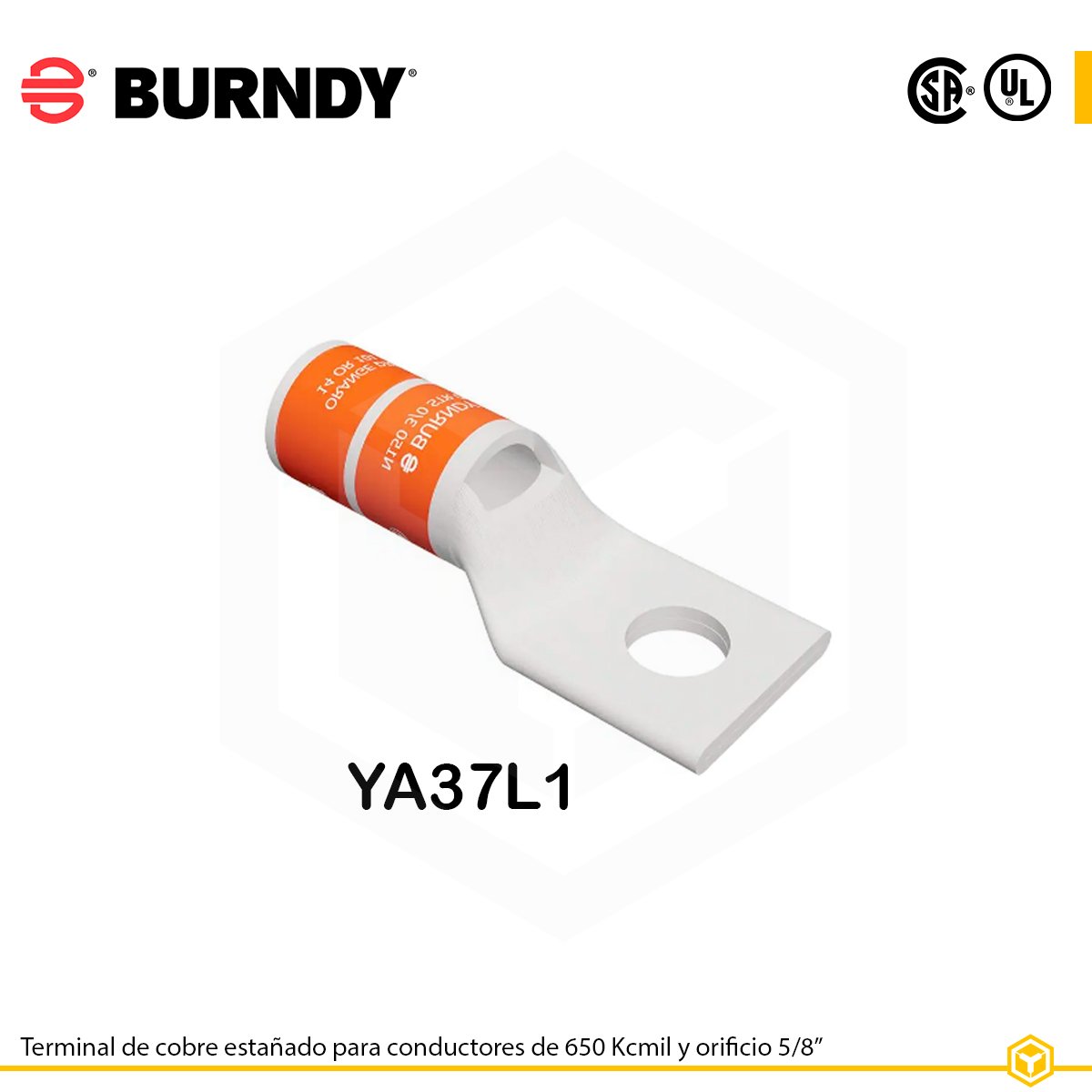 Terminal Burndy YA37L1 de cobre estañado, para cables de 650 kcmil, con orificio único de 5/8″. Ideal para instalaciones industriales y tableros eléctricos de alta capacidad.