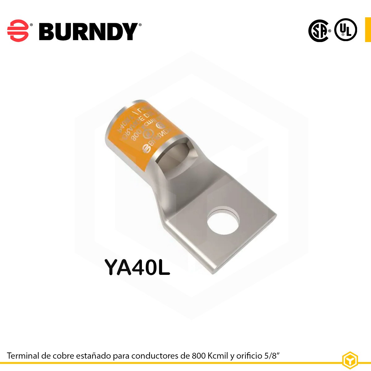 Terminal Burndy YA40L de cobre estañado para cables de 800 kcmil, barril estándar y orificio único de 5/8″. Ideal para tableros eléctricos, centros de control y subestaciones.