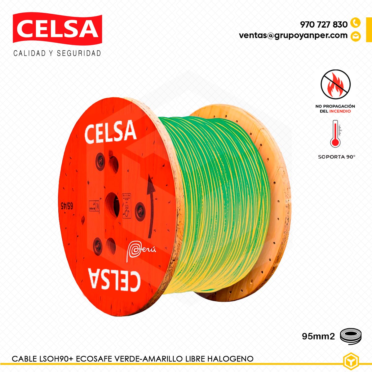 El cable Ecosafe LSOH-90+ de 95mm2 verde-amarillo está fabricado con cobre electrolítico (99,99% pureza) y aislamiento termoplástico libre de halógenos. Soporta hasta 90 °C en operación continua, con excelente resistencia a incendios gracias a su baja emisión de humo y nula generación de gases tóxicos. Cumple normativas NTP-IEC y UL, siendo ideal para locales de pública concurrencia y proyectos donde la seguridad eléctrica y humana es prioritaria.