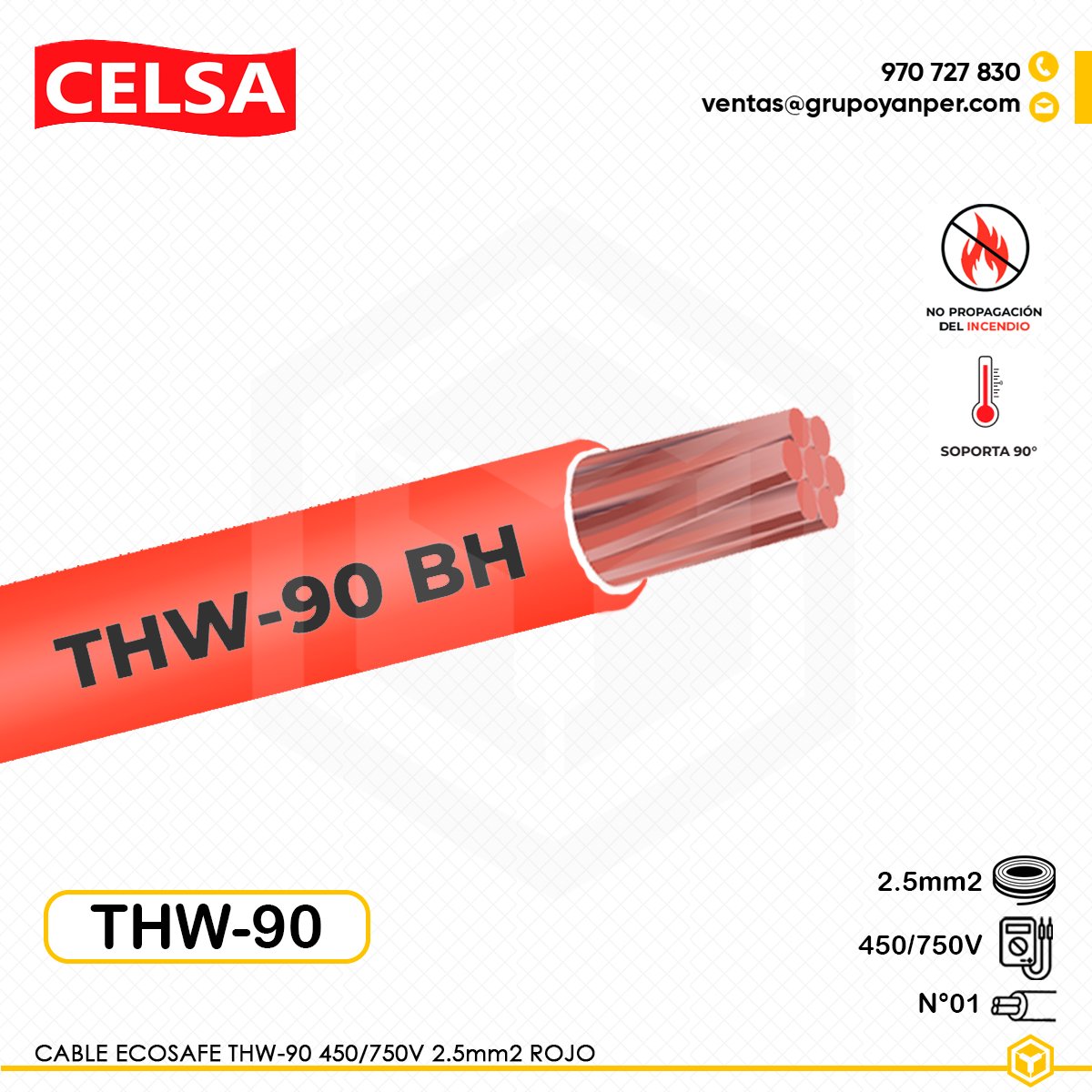 El cable CELSA Ecosafe THW-90 2.5mm2 450/750V ofrece alto rendimiento y seguridad en instalaciones eléctricas de baja tensión. Su conductor de cobre electrolítico clase 2 y su aislamiento de PVC especial sin halógenos garantizan baja emisión de humo y gases tóxicos. Su diseño asegura resistencia a la propagación del fuego, larga vida útil y cumplimiento con normas nacionales e internacionales.