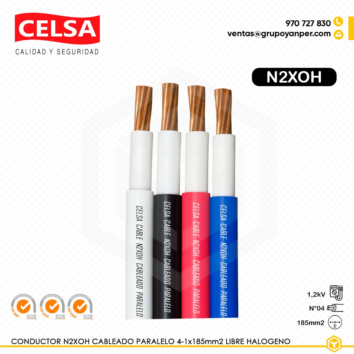 El cable CELSA N2XOH 4-1x185mm es un conductor bipolar paralelo fabricado con cobre electrolítico de alta pureza (99,99%), aislamiento de polietileno reticulado (XLPE) y cubierta exterior en compuesto termoplástico LSOH libre de halógenos. Adecuado para tensión de 0,6/1 (1,2) kV, combina seguridad contra incendios, baja emisión de humos y nula emisión de gases tóxicos, cumpliendo normativas IEC, NTP y UL.