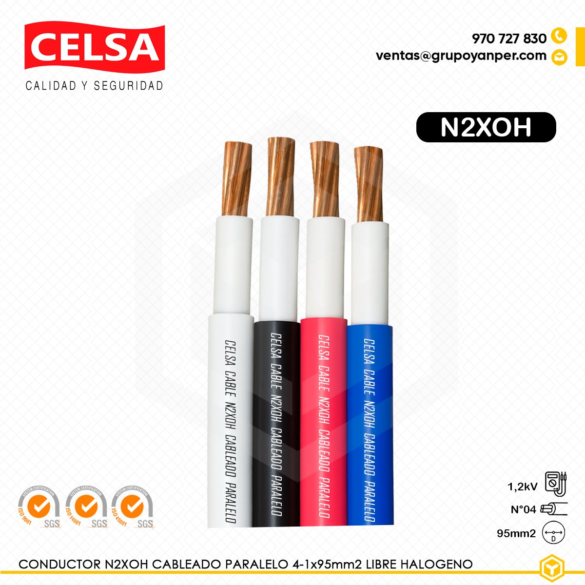 El cable CELSA N2XOH 4-1x95mm2 es un conductor bipolar paralelo fabricado con cobre electrolítico de alta pureza (99,99%), aislamiento de polietileno reticulado (XLPE) y cubierta exterior en compuesto termoplástico LSOH libre de halógenos. Adecuado para tensión de 0,6/1 (1,2) kV, combina seguridad contra incendios, baja emisión de humos y nula emisión de gases tóxicos, cumpliendo normativas IEC, NTP y UL.