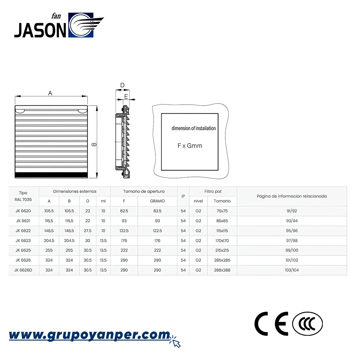 JK6626 REJILLA PARA VENTILADOR CON FILTRO RAL7035 324x324MM JASON FAN