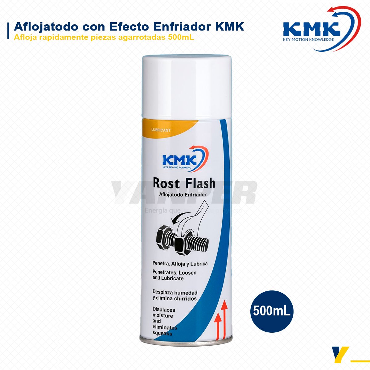 El KMK Rost Flash Lubricante con Efecto Enfriador actúa combinando un potente poder de penetración con un choque térmico localizado que contrae el metal, ayudando a romper la unión causada por óxido, suciedad o corrosión. Su formulación permite que el producto penetre profundamente en roscas, pernos y mecanismos bloqueados, reduciendo el esfuerzo necesario para el aflojamiento. Además, lubrica las superficies tratadas, desplaza la humedad y elimina chirridos, mejorando la eficiencia del mantenimiento mecánico e industrial.