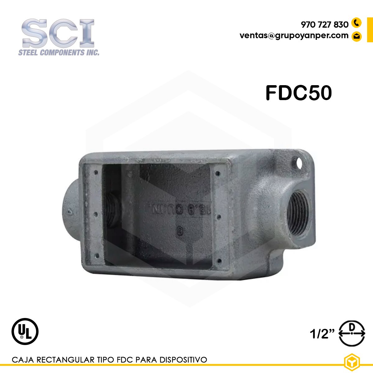La caja rectangular SCI tipo FDC50 de 1/2” está fabricada en hierro maleable con acabado galvanizado y diseñada para alojar dispositivos eléctricos en instalaciones con conduit rígido o IMC. Cuenta con roscas NPT cónicas con bujes integrales que aseguran hermeticidad, incluye tornillo interno de puesta a tierra y es apta para uso en lugares húmedos cuando se combina con cubierta FSFDCM1 y empaque FSFDCG. Su robustez permite instalación en muros de concreto y aplicaciones de alta exigencia.